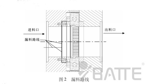 造成板式換網(wǎng)器密封處漏料原因:由圖1不難看出,在進(jìn)料密封環(huán)通過調(diào)隙螺母與滑板緊密配合的情況下,進(jìn)料密封銅環(huán)的另一端會和進(jìn)料口的底端面分離,即產(chǎn)生一定的間隙。在這種情況下,要想真正不漏料,只有進(jìn)料密封銅環(huán)的外徑和進(jìn)料密封銅環(huán)放置槽的配合精度很高才行。但事實上,在加工中,由于加工誤差的原因,這種高配合是很難做到的,這時就會出現(xiàn)如圖2所示的現(xiàn)象,會產(chǎn)生微小的相對配合間隙。由圖2不難看出,當(dāng)塑料溶液受到的壓力稍大時就會從產(chǎn)生的間隙中漏出來。